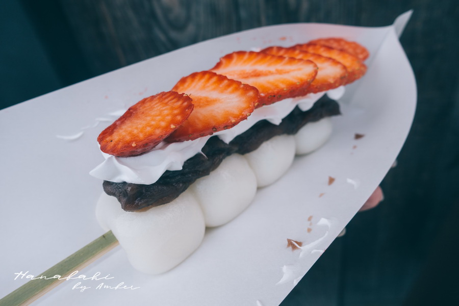 之前看朋友推薦了一間附近的糰子店叫“古都芋本舖”,這次經過我也買來吃看看。白玉糰子上疊著紅豆泥、鮮奶油還有片片的草莓,一整串沉甸甸的分量拿在手上很扎實。