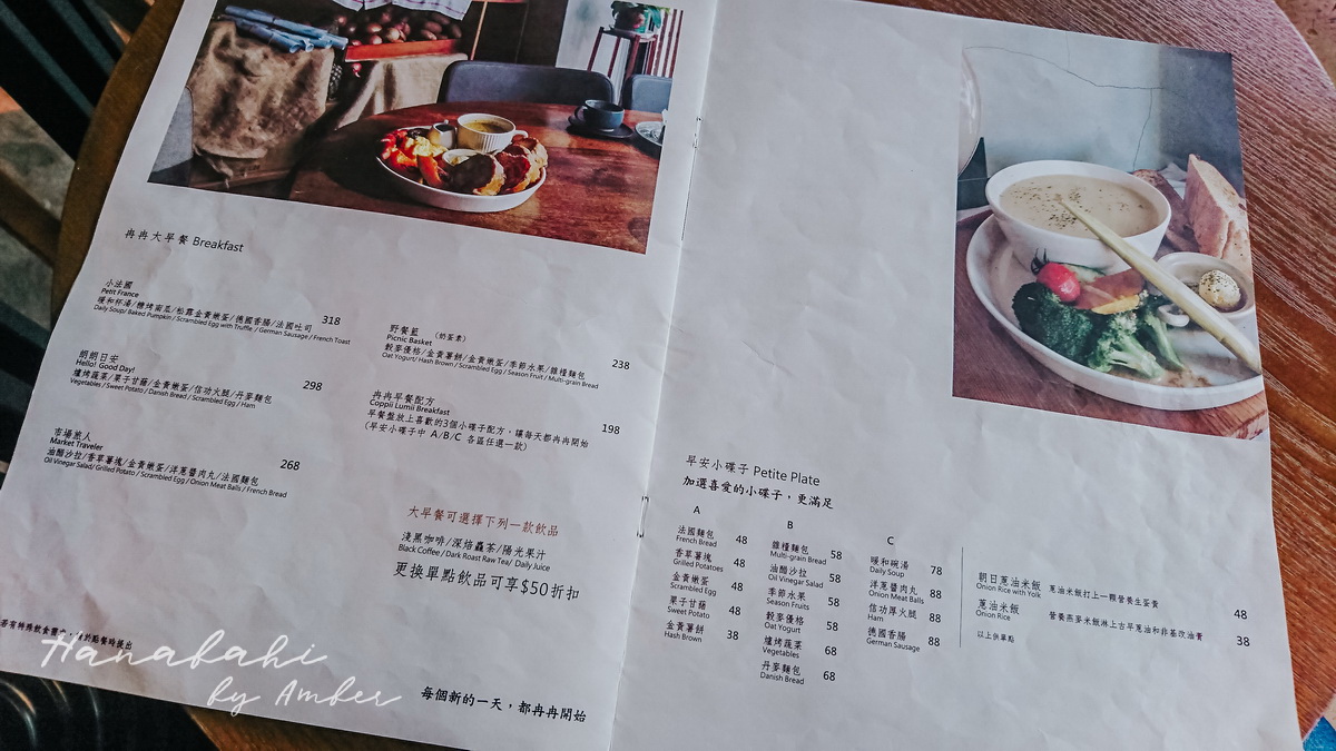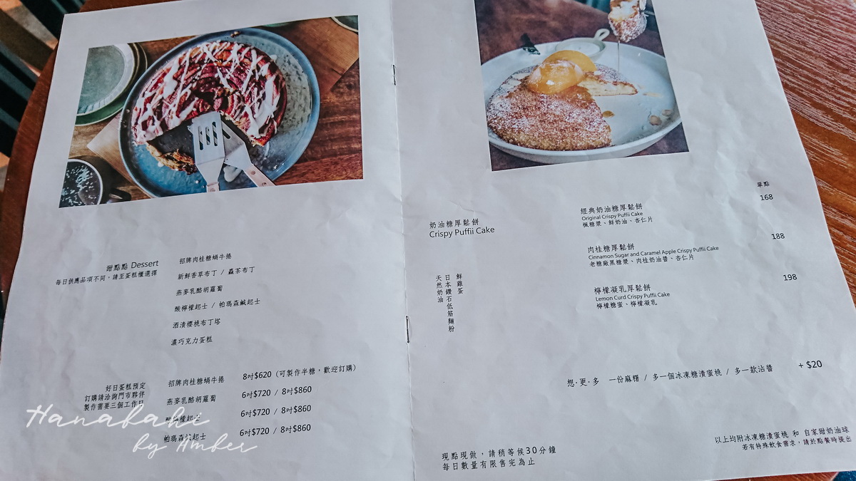 除了餐點名稱外,菜單也都有標上小字描述詳細內容(菜單有很多頁,其它頁我把它放在文末提供給大家參考囉!需要注意的是,有些餐點有供應時間的區隔,所以需要確認該時段有無提供:單點的主餐或排餐中午12點後提供、奶油糖厚鬆餅為下午2點後提供。原本第二次來想點招牌的奶油糖厚鬆餅嚐嚐,但沒發現原來有時間區隔而來太早了,所以還是飲恨沒嚐到!主餐看起來也很不錯,總之選擇非常多元)